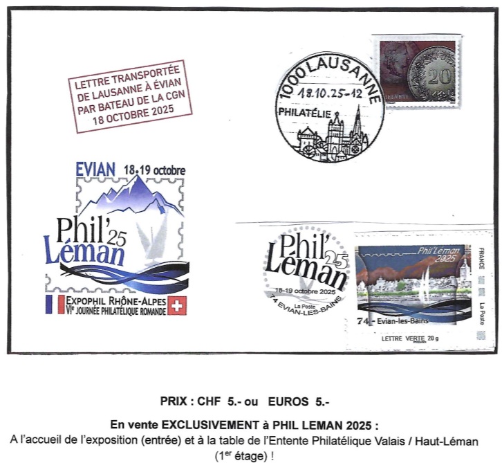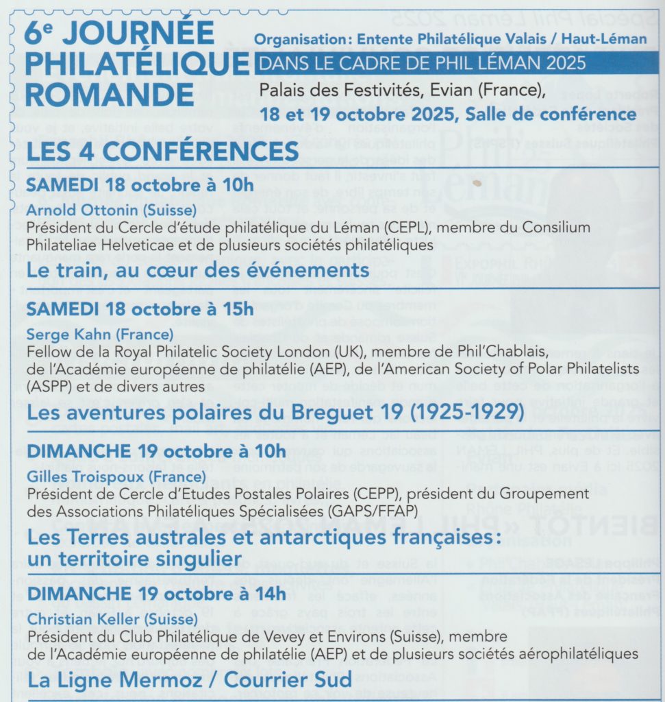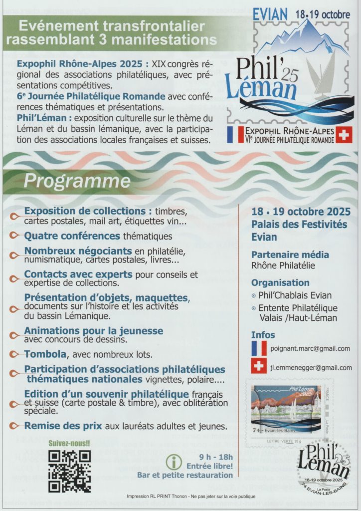 18 et 19.10.2025 Sa & Di | Phil Léman Evian-les-Bains exposition, bourse, conférences, tables partagée entre SPR, SLT, SRC participation d’autres sociétés philatéliques suisses À la Salle des Festivités, Evian-les-Bains France |