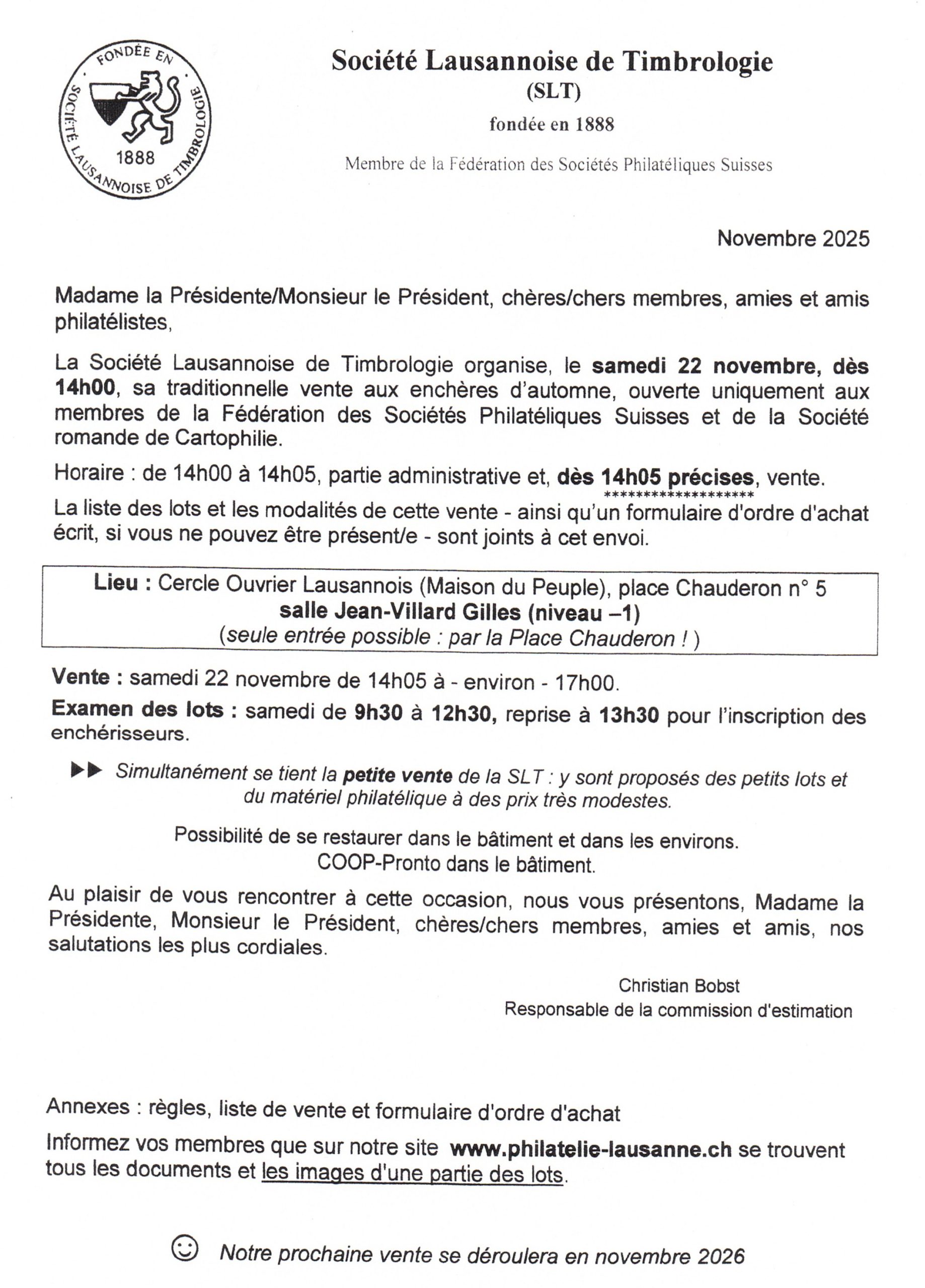 21.11.2025 SPR | Conférence philatélique à définir à la Maison du Peuple, Rue de Crissier 6, 1er étage salle Gloor 19h30 |