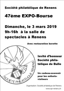 Le dimanche 3 mars 2019 la Société Philatélique de Renens a organisé à la salle de spectacles de Renens une grande EXPO-Bourse avec quelques 80 cadres d’exposition, 8 marchands, une buvette et un stand pour les Jeunes visiteurs.
